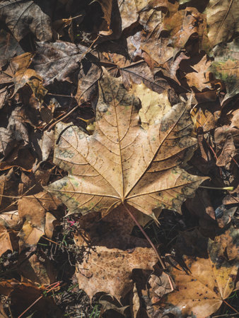 Autumn leaves fallen lie on the ground. A recently fallen maple leaf from above. Muted brown color scheme. beautiful autumn. top view. Texture of leaves. pattern