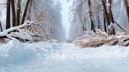 Snow blankets the ground while trees stand tall with frost, creating a peaceful winter pathway. A serene atmosphere invites exploration and tranquility.