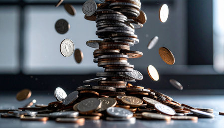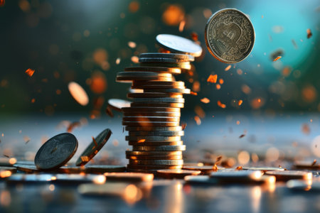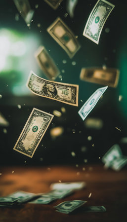 An artistic depiction of dollar bills and coins cascading down, creating a lively scene that symbolizes financial dynamics and economic transactions.