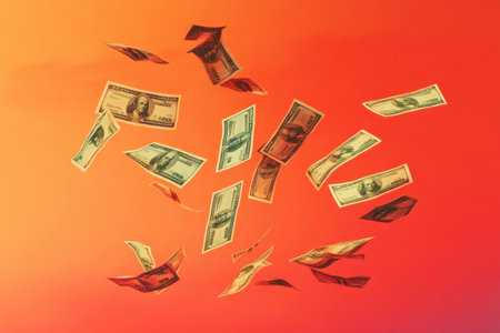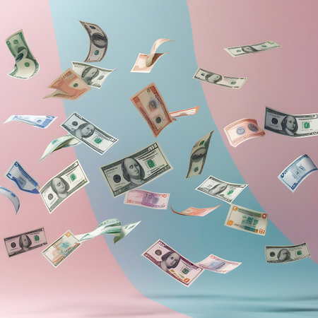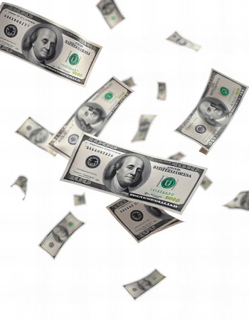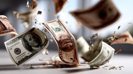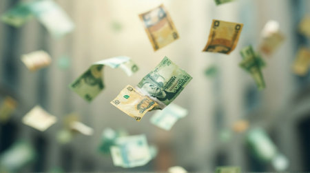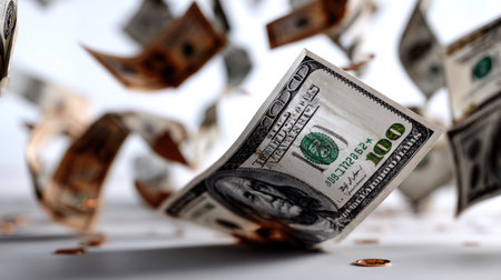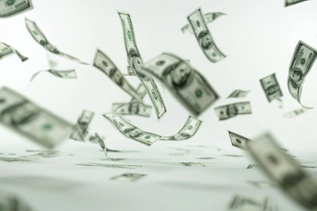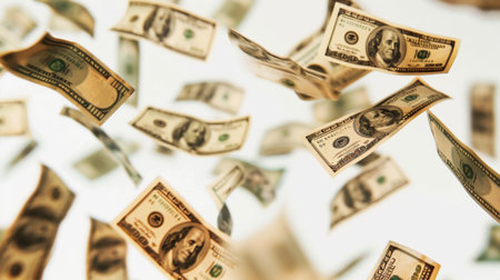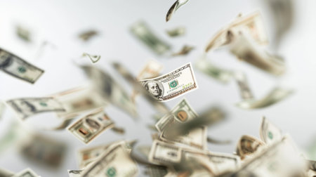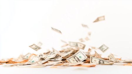 A cascade of bills falls onto a surface, illustrating abundance and wealth in a bright setting
