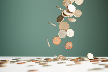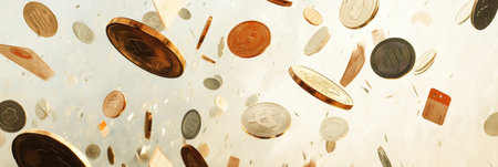 Dynamic image capturing falling currency notes and scattered coins, conveying concepts of finance, wealth, and economic transactions in a vibrant indoor setting.