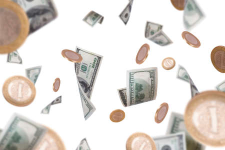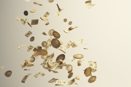 A dynamic scene showcasing dollar bills and coins gracefully falling against a light backdrop, representing themes of wealth, finance, and modern monetary systems.