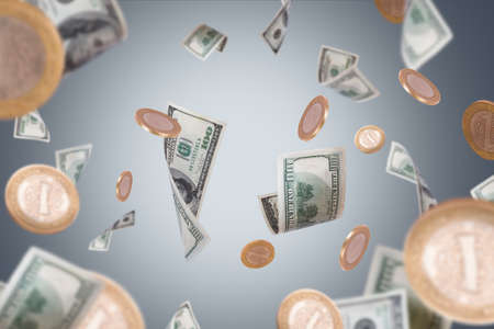 A dynamic scene showcasing falling money, with a focus on hundred dollar bills and copper coins. Perfect for finance and economic themes, this image captures the essence of money in motion, representing investment, wealth, and financial transactions.