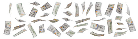 Collection of Falling One Hundred Dollar Bills Isolated on a White Background.