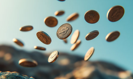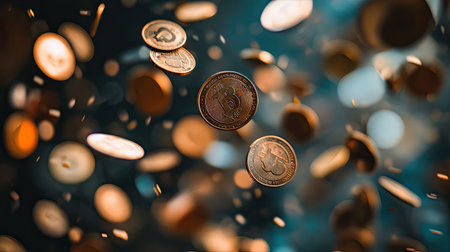 Golden coins captured in mid-air as they fall, with a dramatic bokeh background, symbolizing wealth, fortune, and financial success in a dynamic and energetic setting.