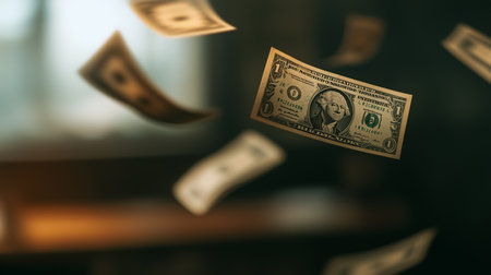 Several one dollar bills are falling through the air, creating a dynamic image of money in motion against a blurred background
