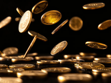 Golden coins cascade through the air, creating a mesmerizing spectacle. The rich contrast against the dark backdrop enhances their allure, representing prosperity.