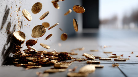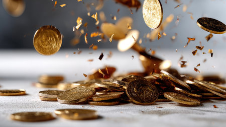 A captivating image of golden coins falling onto a sleek marble surface, symbolizing wealth and abundance. The striking contrast and shine create a modern and elegant ambiance.