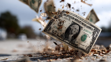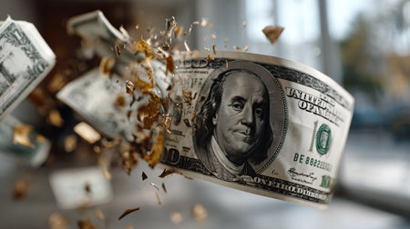 A captivating image showcasing shattered dollar bills swirling amidst shredded leaves, symbolizing financial chaos and transformation in a minimalist setting.