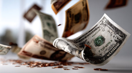 A dynamic scene showcasing flying dollar bills and falling pennies, symbolizing financial transactions and economic themes in a blurred background.
