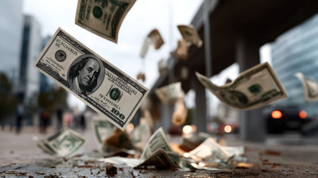 This dynamic image captures dollar bills flying through the air, symbolizing financial success, wealth, and the fast-paced world of money and investment.