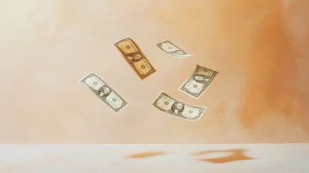 Five one dollar bills falling slowly on a beige background, creating soft shadows on the white surface below, evoking concepts of wealth, savings, and financial prosperity