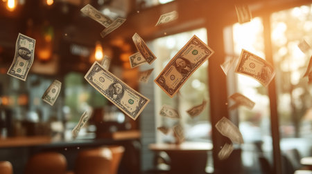 Many one dollar bills falling from the ceiling in a restaurant, celebrating economic success, as golden light shines through the windows
