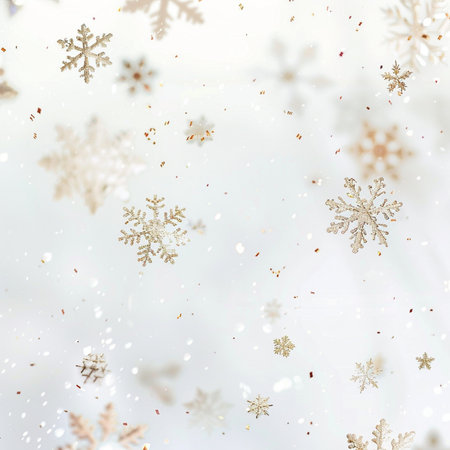 Photorealistic image of falling snow, with individual snowflakes in sharp focus and glistening with reflected light against a blurred bokeh background. Christmas atmosphere. Isolated on a white background with no shadows. High detail, 8k.