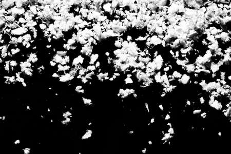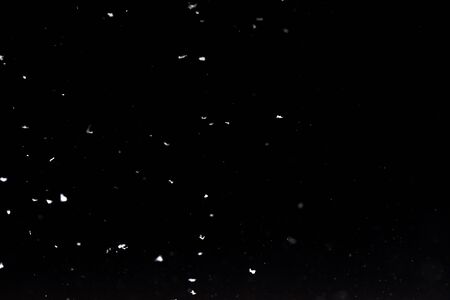 Falling snow at night. Bokeh lights on black background, flying snowflakes in the air. Overlay texture. Snowstorm