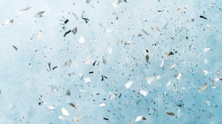 A photograph of tiny silver particles scattered across the surface, creating an intricate pattern on a light blue background. The particles appear to be floating in mid-air and create delicate shapes that add depth and texture to the composition. The overall effect is one of elegance and simplicity, with each particle adding its own unique element to the scene. --chaos 30 --ar 16:9 --v 6.1 Job ID: ca2414da-127b-4bd2-9ee3-bb3b4b9eee48