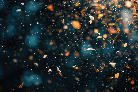 With showing falling confetti and glittering fragments in a dark, moody atmosphere with soft bokeh lights and a bright light source above. resolution