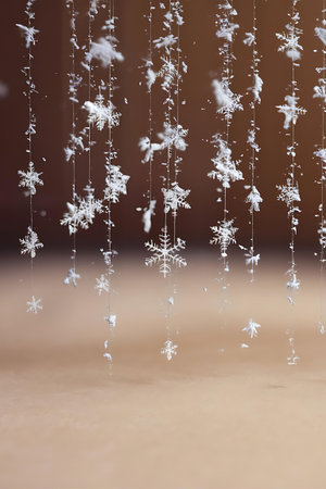 Strands showing cascading strands of shimmering metallic confetti in various shapes including circles and stars falling against a dark background keywords:...