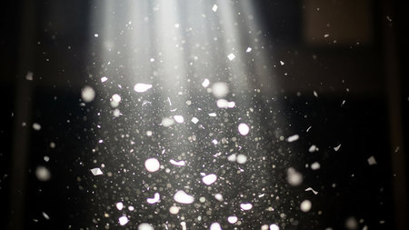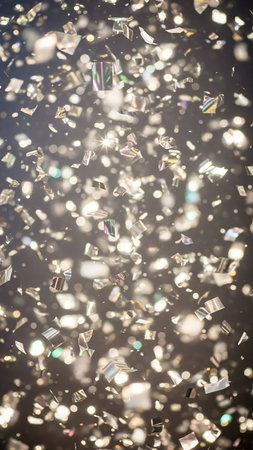 A vibrant cascade of colorful confetti and shimmering glitter falls and swirls in mid-air, illuminated by a bright, luminous light source creating a dynamic,...
