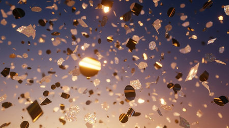 Golden and silver confetti pieces are scattered and falling against a soft gradient sunset sky, creating a festive and celebratory atmosphere.
