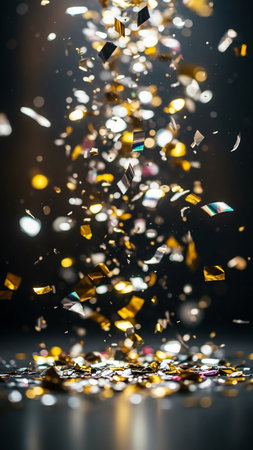 Golden and silver confetti pieces are falling and scattering across a dark, reflective surface, illuminated by soft bokeh lights in the background.