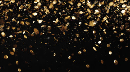Gold confetti floats over a dark surface, catching light with sparkling drama and a luxurious mood. Ideal for events, parties, and celebration themes to evoke glamor and anticipation. Generated A.I.