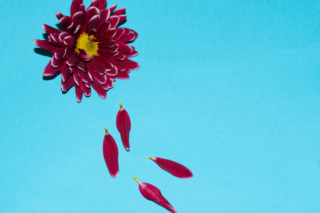Bouquet of carnations hangs over a blue background and fallen petals.