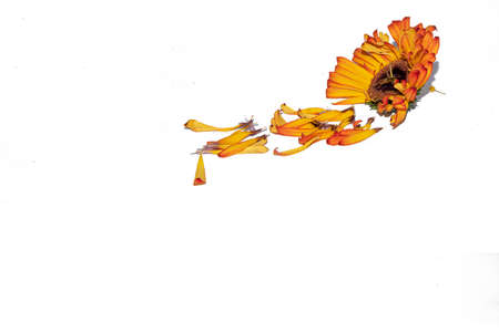 Close-up of an orange flower with soft petals and a bright center surrounded by scattered petals on white