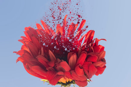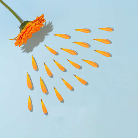 Orange gerbera daisy flower as a shower head splashing petals as water drops on blue background. Concept of beauty, purity, freshness and harmony.