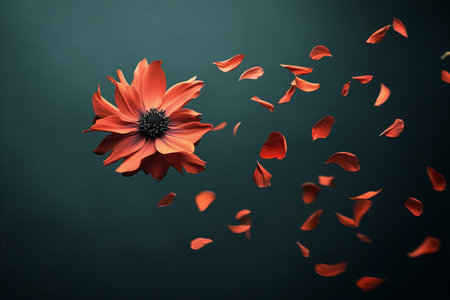 A single orange flower with a dark center, its petals are blowing away in the wind, creating a dynamic and ethereal effect against a dark, moody background.