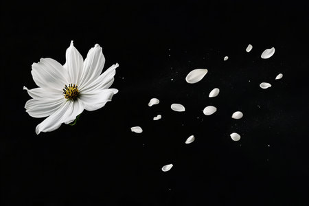 A delicate white cosmos flower with scattered petals against a stark black background, creating a minimalist and elegant composition.