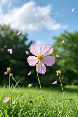 Light pink petals drifting gracefully over a vibrant field of daisies and lush grass, capturing the essence of a serene spring day. 3d rendering