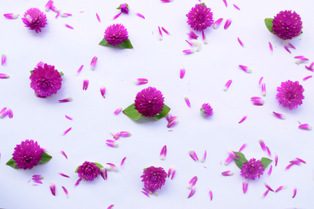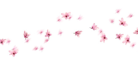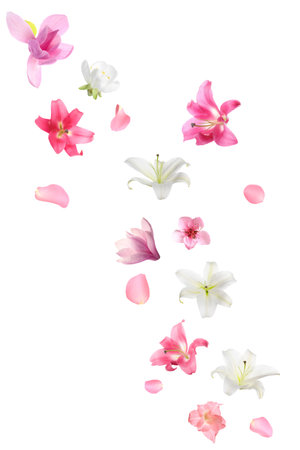 Beautiful flowers and petals falling against white background