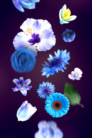 Beautiful flowers in blue shades falling on purple gradient background