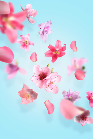 Beautiful flowers and petals flying against light blue background