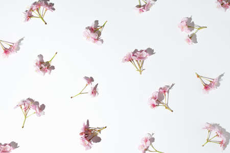 Fresh pink Japanese cherry blossoms on a white background. Minimal concept.