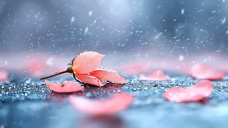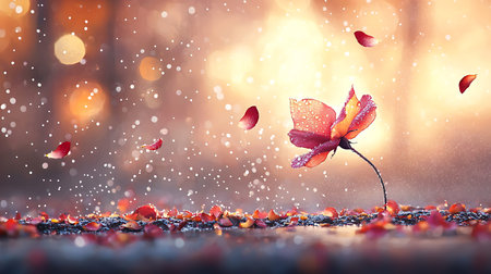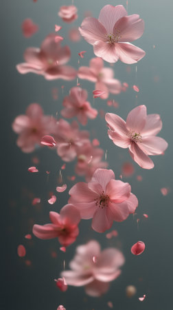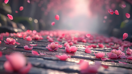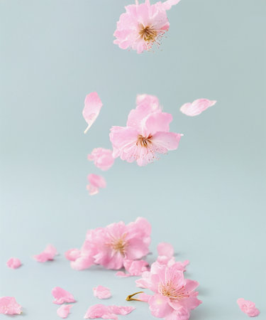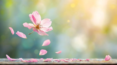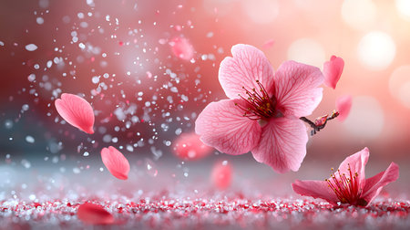 Captivating scene featuring delicate pink cherry blossoms and falling petals with a sparkling background, evoking beauty and tranquility in nature.