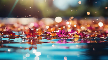 Stunning image of colorful petals gently floating on water, creating a peaceful and serene scene. The reflection enhances the beauty.