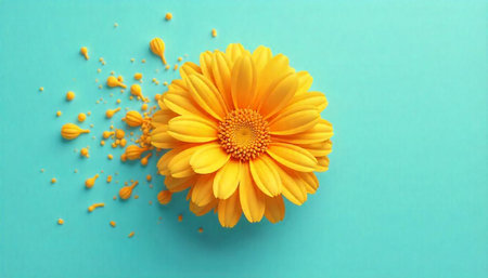 Bright yellow flower on turquoise background with paint splatter