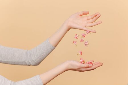 Woman hands and pink hyacinth flowers and petals