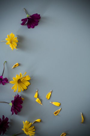 Yellow and purple flowers arrangement with petals on gray background.
