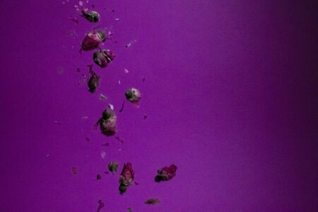 A delicate pink flower loses its petals against a stark black background, creating a visually striking and ethereal image.