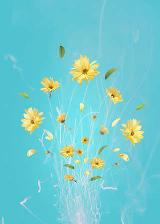 Flying sunflowers and petals on blue background
