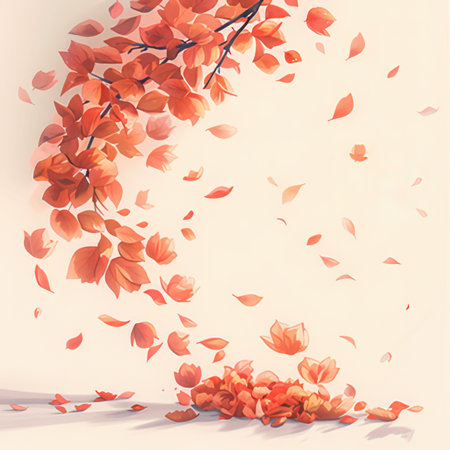 Orange chrysanthemums with falling petals, in a serene autumnal scene.