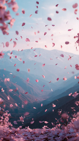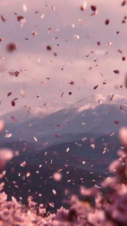 Beautiful cherry blossom petals fly in the air over the mountains