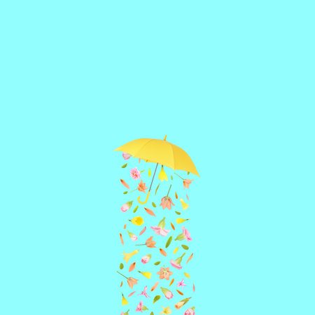 Beautiful flowers falling down from lovely yellow umbrella on bright blue square vivid pastel background. Floral season nature concept. Idea copy space and natural blooms rain