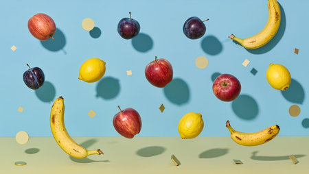 Fruits float against a blue background with shiny golden shapes scattered around.