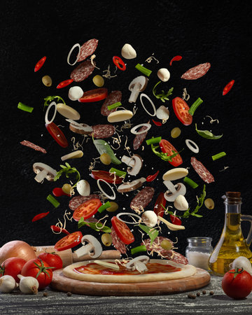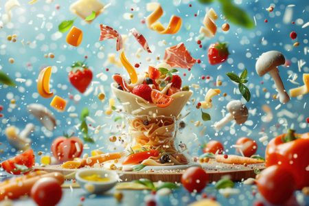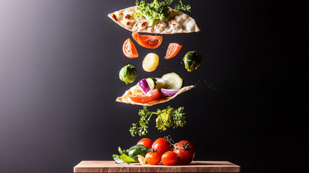 A vibrant display of fresh ingredients flying through the air, showcasing culinary creativity and excitement. Perfect for food-related projects emphasizing freshness and color.