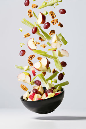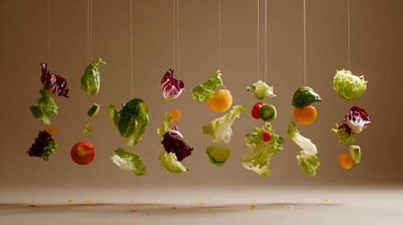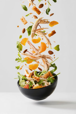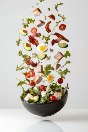 Dynamic image of various salad ingredients tossed and suspended dramatically against a dark background