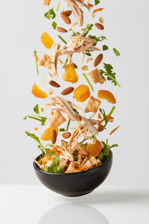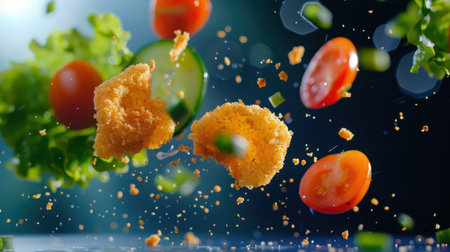 A dynamic scene capturing fresh ingredients in motion, highlighting crispy bites, colorful vegetables, and a sense of culinary artistry and freshness. Perfect for food-related projects.